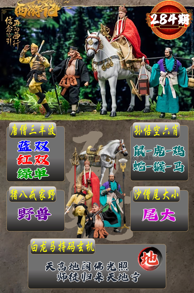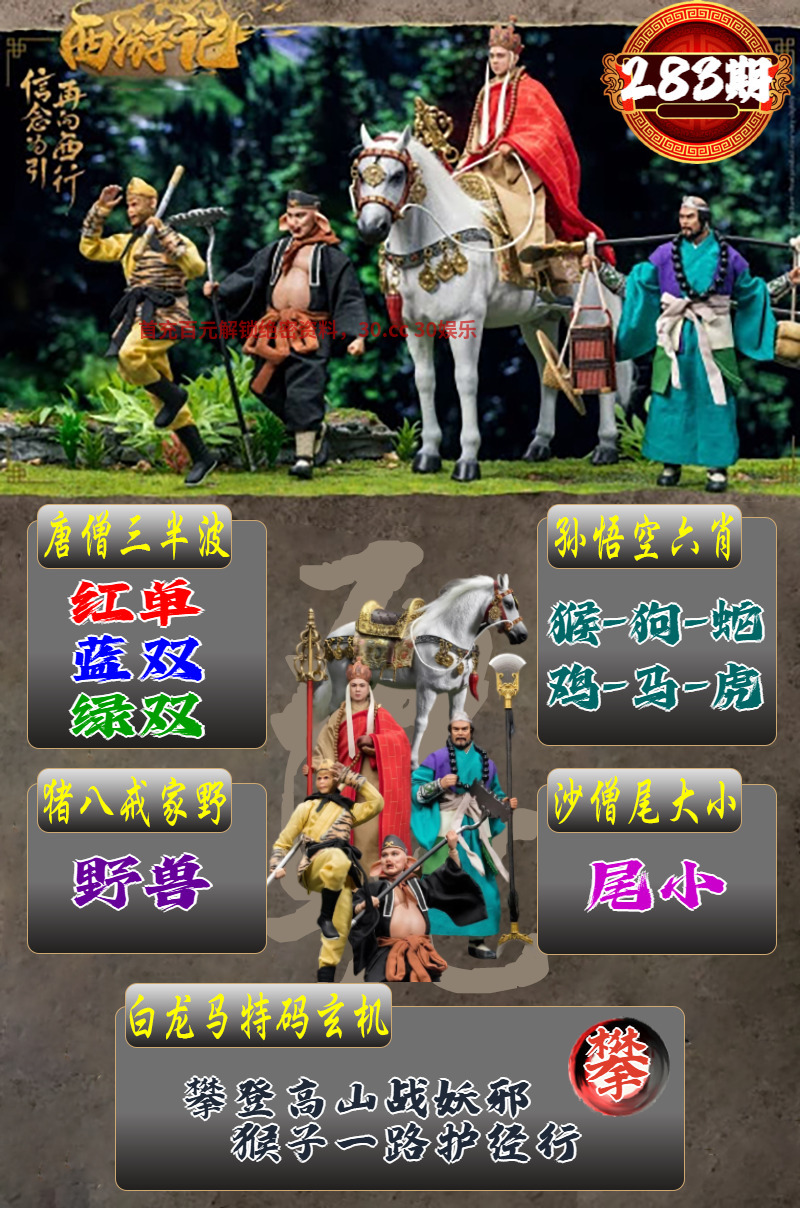 288期:解西游记转寄【心】 白龙马玄机:洁白如雪毛茸茸,步履轻盈心无忧。 孙悟空六肖:羊马鼠鸡蛇狗 唐僧三半波:红单+绿双+蓝双 猪八戒家野:家禽 沙僧尾大小:尾小 |